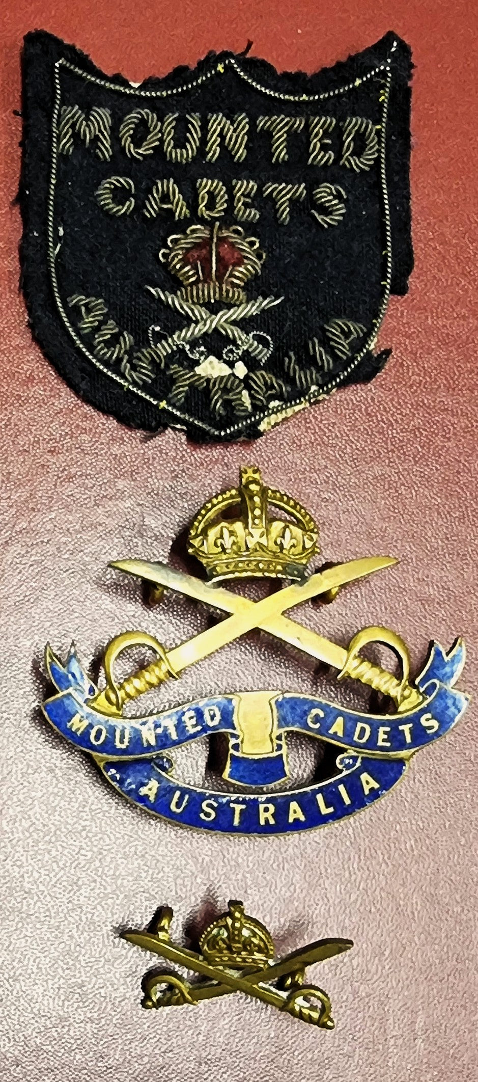 An ultra rare Mounted Cadets set of badges 1900 to 1912 period. Cossum 106. Comprising Bullion patch (showing wear), a near mint enamel Hat badge by Stokes and a single collar.