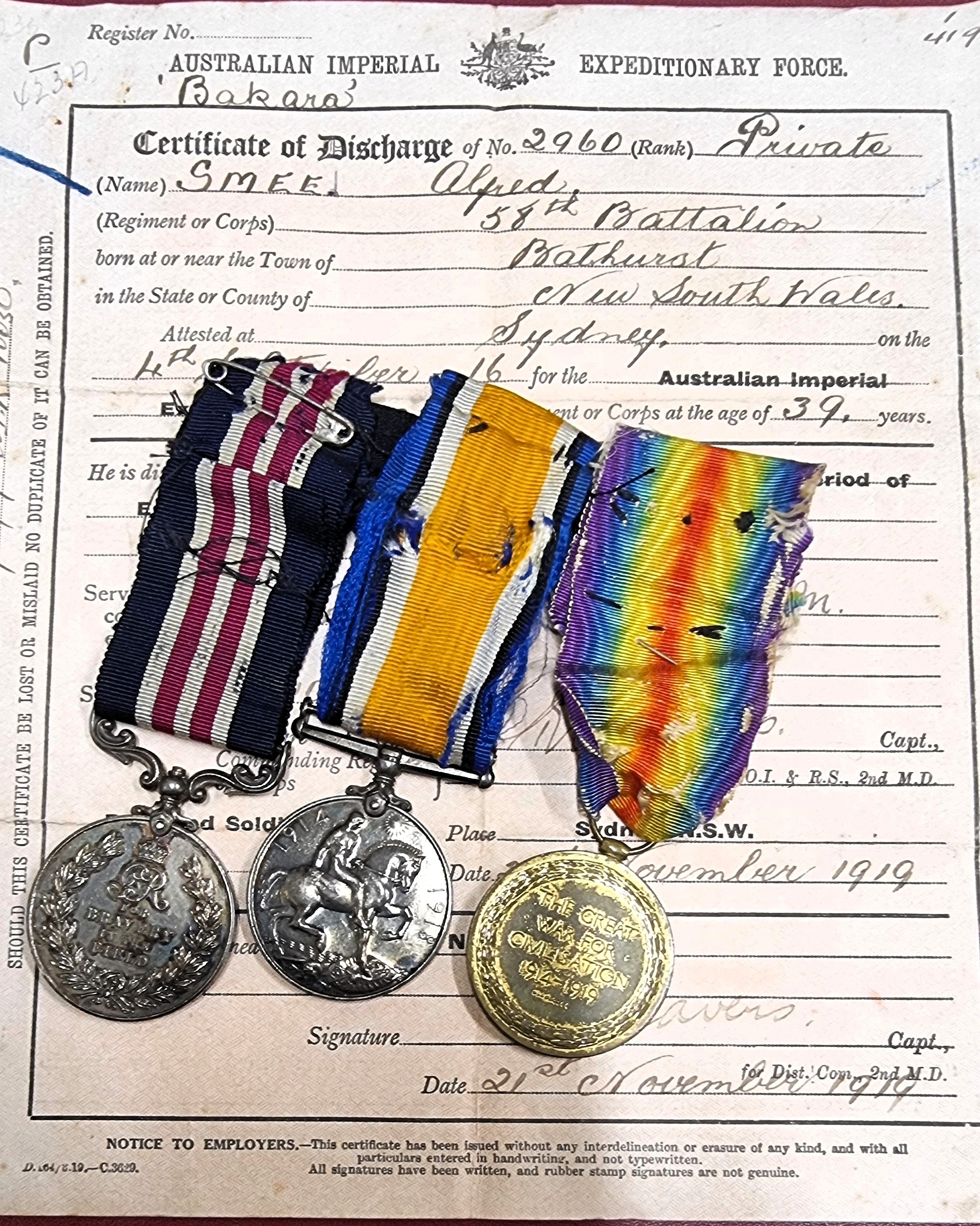 Three: Military Medal G.V.R, British War & Victory Medals. Impressed 2960 Pte. A. Smee. 58BN AIF. Comes complete with original Discharge paper.