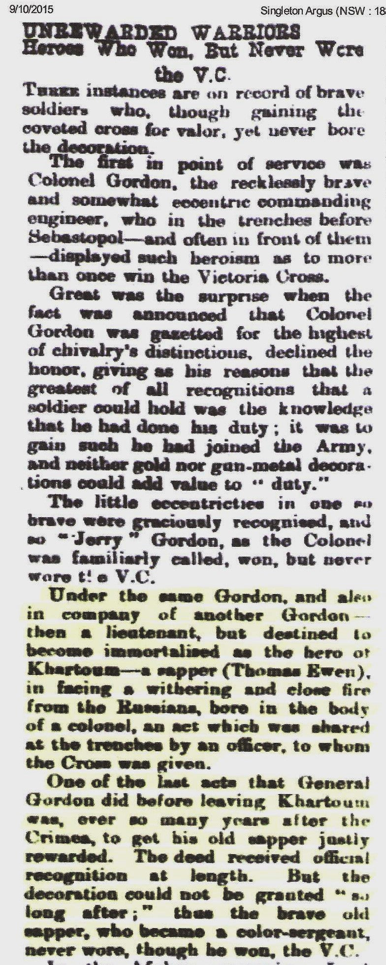 The official history mentions Sapper Ewens bravery on a number of occasions including along side Colour Sgt Henry McDonald when he earns his Victoria Cross. It is interesting to note that years after the event General Gordon (of Khartoum fame) was still campaigning to have Ewen recognized for his gallantry.