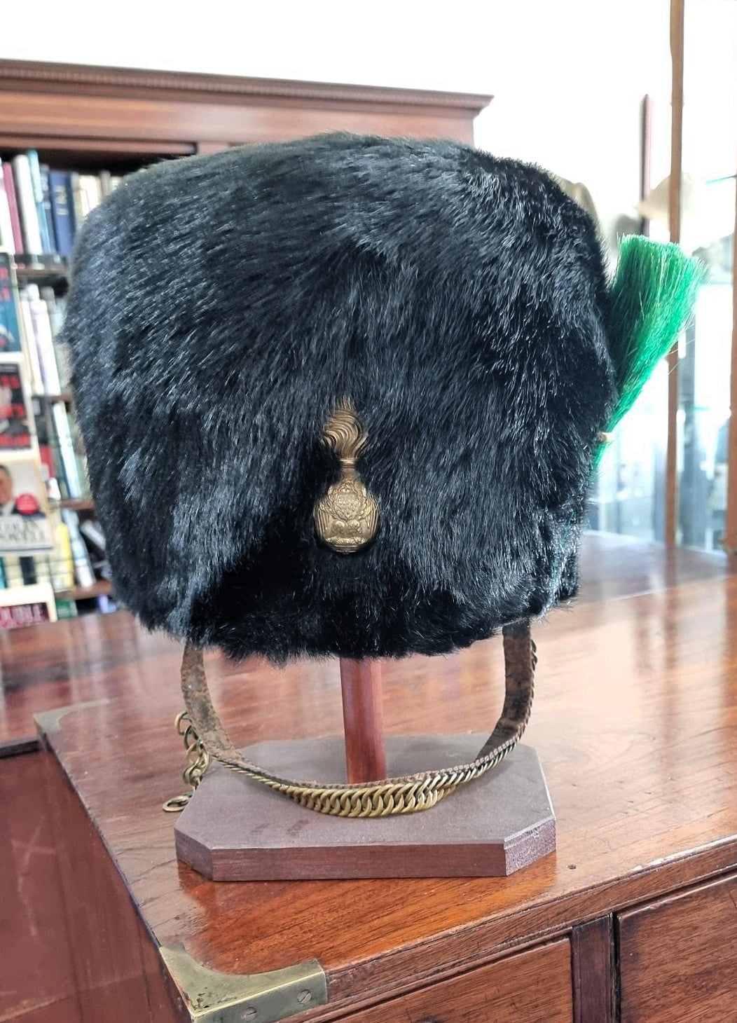 The Rifle Brigade (Prince Consort’s Own) an Officer’s Black Persian Lambskin Busby. A good quality example as described in Dress Regulations complete with rifle green sewn in cap lines, coiled bugle horn badge with green oval boss, complete with black leather chin strap, sweat band and dark crimson silk lining, scarce with original black ostrich plume over black vulture lower plume with retention ring and plume tin, good condition